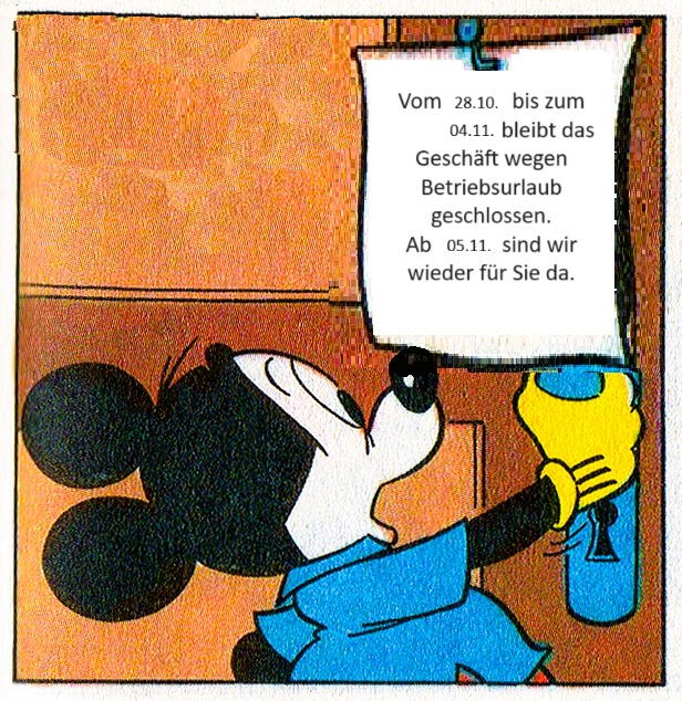 von Dienstag den 28.10.2025 bis Dienstag den 04.11.2025 wegen Urlaub geschlossen !